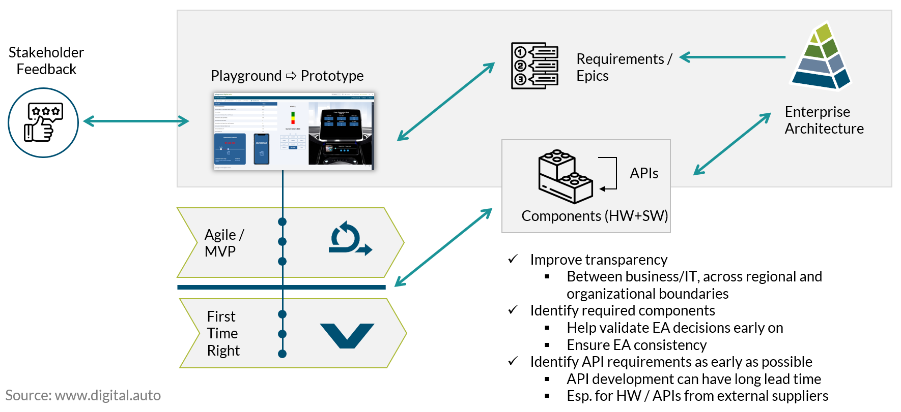 4. **Agile Development with MVP**: Encourages incremental delivery of minimum viable products while ensuring robust and validated components through the **First Time Right** principle.