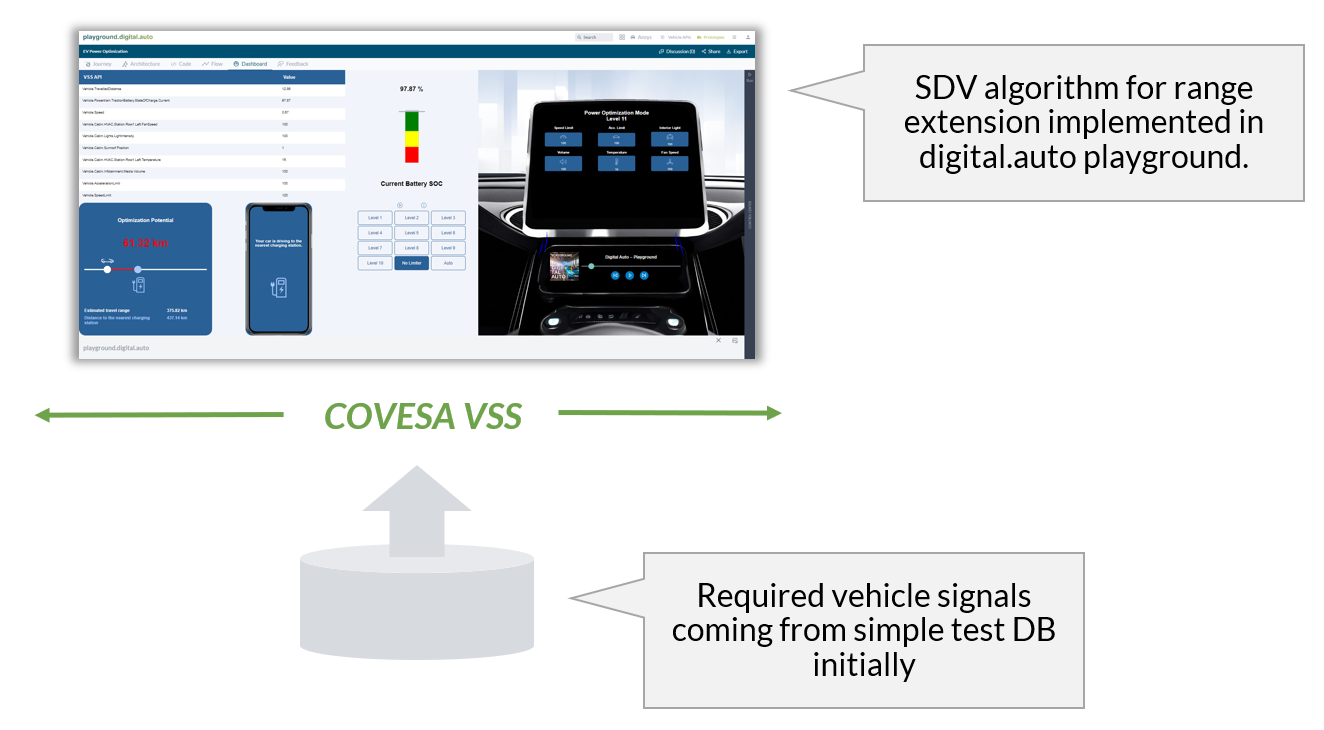 Leveraging COVESA's Vehicle Signal Specification (VSS), the algorithm interacts with mock-up vehicle signals, initially coming from a test database, to demonstrate range-saving capabilities like powering down non-essential energy consumers (e.g., HVAC or infotainment). This cloud-based prototyping validates the solution efficiently before hardware integration, aligning with the *shift-left* philosophy for faster, cost-effective testing and multi-stakeholder alignment.